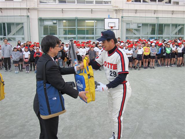 元プロ野球選手の村田兆治氏を招いて江東区立東陽小学校で講演と野球教室が行われました。